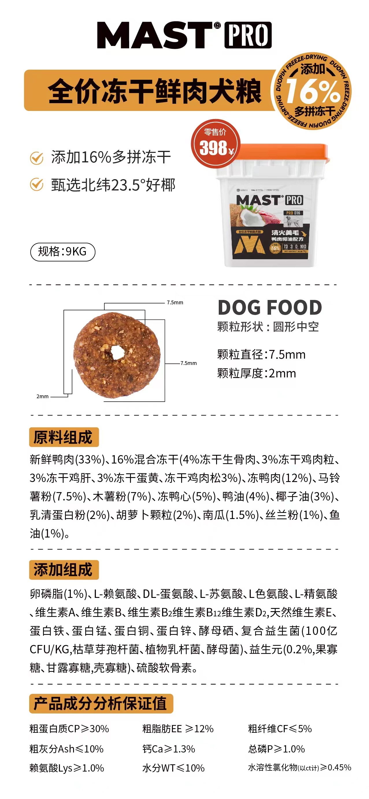 手工下单!MAST鸭肉椰油冻干狗粮9KG心粮MAST系列狗粮mast鸭肉椰油全价冻干鲜肉犬粮mastpro狗粮9kg