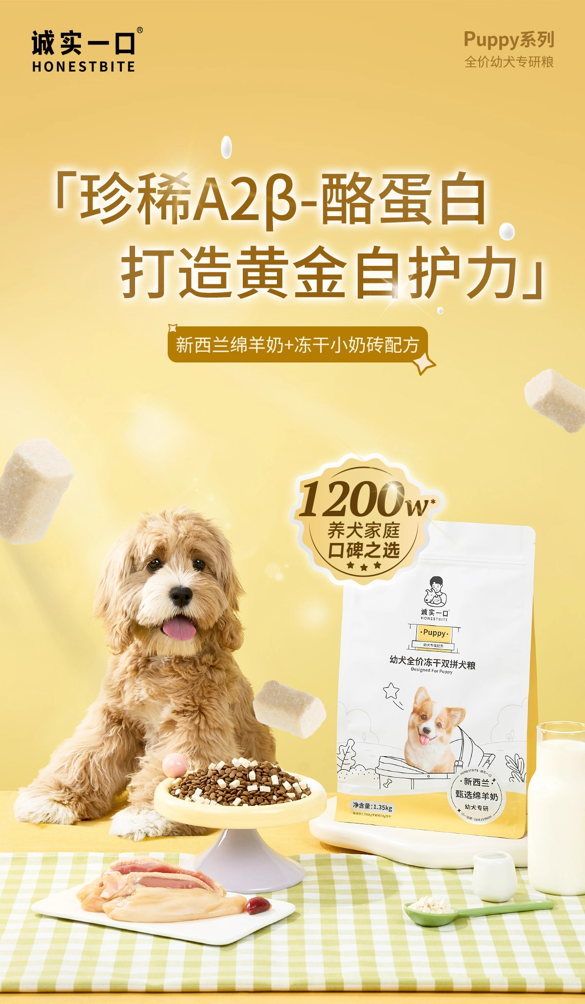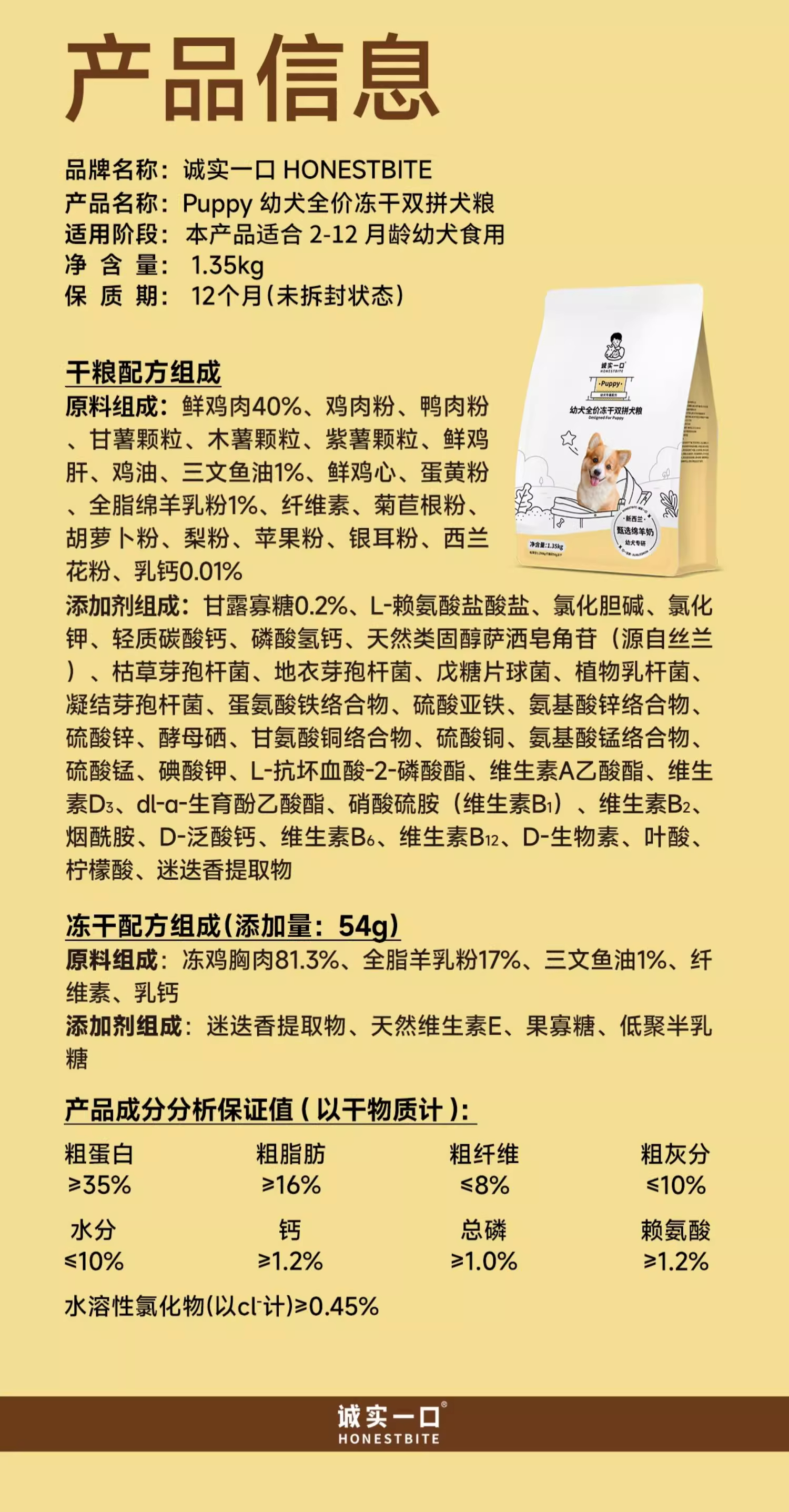 联系客服手工下单!诚实一口Puppy全价冻干双拼幼犬粮1.35kg专研通用型离乳期奶糕小型狗粮1.35kg诚实一口犬粮