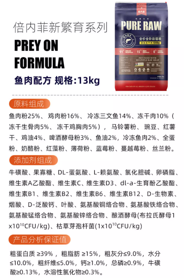 倍内菲金标新繁育鱼肉猫粮13kg倍内菲猫粮倍内菲金标猫粮倍内菲新繁育猫粮倍内菲生骨肉冻干无谷低敏美毛全价倍内非猫粮
